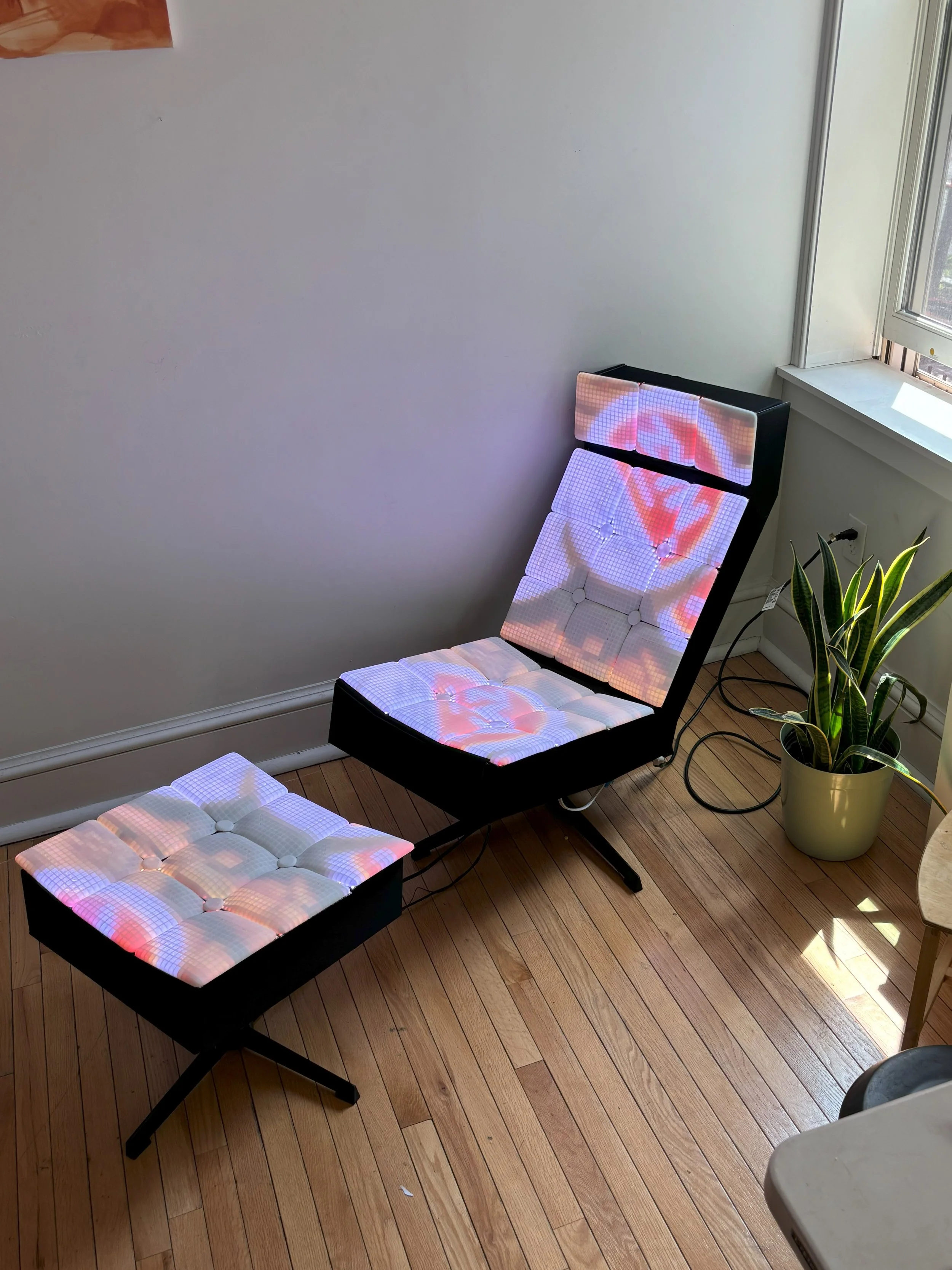 Individually addressable and programmed to screenshare from my laptop. A visual studio python script screen records the laptop, pixelizes the image, sends it in UDP packets over wifi to an esp32 which drives the LED’s.